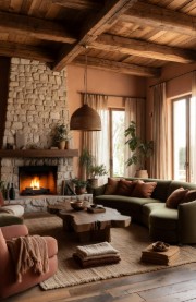 Futuristik stil ise niş kalıyor; yüksek teknoloji ve metalik unsurlar yerine organik formlar, kıvrımlı mobilyalar ve doğal malzemeler (ahşap, taş, keten) ön planda. Soğuk fütürizm yerine “insani sıcaklık” arayışı hakim: örneğin grandma chic (büyükanne şıklığı) ve cottagecore gibi nostaljik dokunuşlar, vintage parçalarla modern formları birleştiriyor. Renklerde ise zeytin yeşili, terracotta, koyu kahve ve yumuşak mor tonları soğuk grileri tamamen deviriyor.