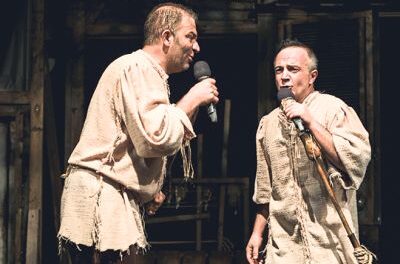 “Oturun yanımıza. Size bir rezillik anlatacağız. Ama öyle böyle değil. Hazır olun. Kalaslarından dekor, heveslerinden oyun yapmak üzere yola çıkmış iki cüretkar oyuncu, gözlerine Shakespeare’in başyapıtı Hamlet’i kestirmiş. Cesur olduklarını söylememize gerek var mı? Keşke her şey perde arkasında kalsaydı fakat asıl hikaye burada başlıyor. Seyircinin karşısına geçerek Hamlet’i oynamaya çalışan bu ikiliden biri, Shakespeare uzmanı gibi davranan yarım porsiyon aktör; diğeri de şarkı söyleme hevesiyle dilinden müzikal kelimesini eksik etmeyen bir şaşkın…