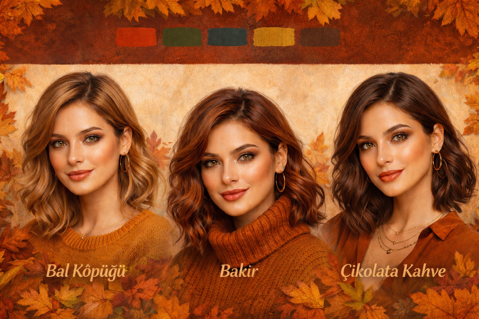 Sonbahar cilt tipi için saç rengi seçimi çok önemlidir çünkü doğru renk yüzü aydınlatır, yanlış renk ise sert gösterir. Genel kural: sıcak yansımalı boyalar seçmektir.
