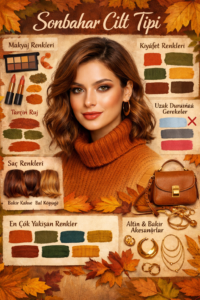 Sonbahar cilt tipi; sıcak, derin ve zengin renklerle en iyi görünümüne ulaşır. Makyajda bakır ve bronzlar, kıyafette toprak tonları, saçta ise sıcak kahve ve kızıl yansımalar bu cilt tipinin doğal güzelliğini ortaya çıkarır. Doğru renk paleti kullanıldığında cilt daha sağlıklı, gözler daha parlak ve genel görünüm çok daha dengeli olur. Sonbahar renk analizine uygun seçimler yapmak, stilinizi zahmetsizce güçlendirmenin en etkili yollarından biridir.